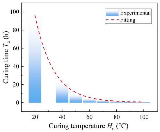 Specimens cured at 20 °C for 96 h are considered fully cured and serve as the benchmark for comparison. As depicted in Figure 4, the relationship between curing time and temperature within the studied range (20–100 °C) is described by Equation (1):