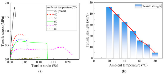 Tensile behavior of epoxy resin at different ambient temperatures. (Reproduced with permission from [26]. Copyright 2025, Acta Materiae Compositae Sinica). (a) Stress–strain curve; (b) tensile strength-test ambient temperature curve.