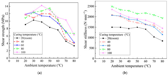 Shear performance at different curing and ambient temperatures. (Reproduced with permission from [26]. Copyright 2025, Acta Materiae Compositae Sinica). (a) Shear strength test ambient temperature; (b) shear stiffness test ambient temperature.