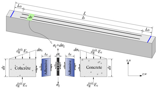 After prestress release, the RC beam achieves equilibrium. Considering an infinitesimal segment dx, the application of static equilibrium yields Equation (2), which relates the interfacial bond shear stress along dx to the tensile strain and thickness of the CFRP: