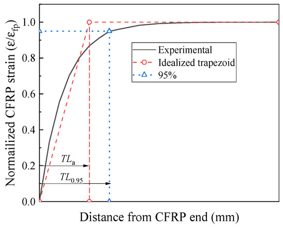 In this study, the equal area method is employed to calculate the prestress transfer length TLa, as illustrated in Figure 11. The vertical axis of the strain distribution diagram is normalized by the design strain value εfp. The strain variation is idealized as a trapezoid of unit height, such that its area equals that enclosed by the actual strain distribution curve, as expressed in Equation (16):