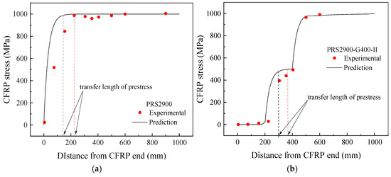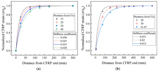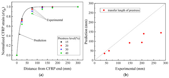 As shown in Figure 12, Rezazadeh [31,32] applied this approach to calculate the CFRP strain distribution and the prestress transfer length after prestress tensioning in experimental studies. The method accurately predicted the CFRP strain distribution for specimens with a 15% prestress level but underestimated the prestress transfer length for prestress levels of 20%, 30%, and 40%.