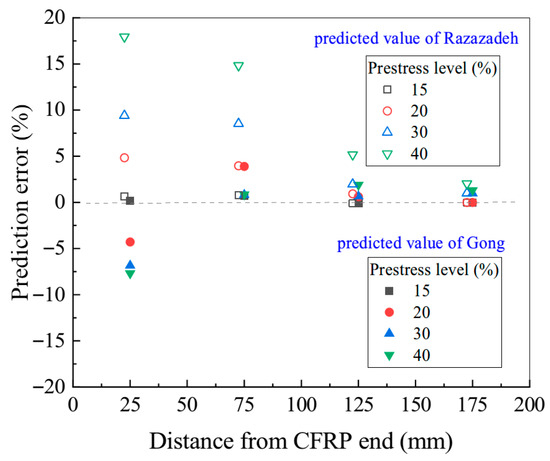 Figure 16 demonstrates that, when applied to Rezazadeh’s experimental data [31,32], the proposed method with the stiffness coefficient correction restricts the prediction error of the prestress transfer length to within 10% for all test scenarios. This result represents a significant improvement over the original model, which exhibited a maximum error of up to 20%. The largest prediction error occurs near the CFRP end, where contraction is most pronounced. As the measurement point moves away from the end, the degree of contraction decreases, and the prediction error rapidly diminishes. Moreover, higher prestress levels result in greater contraction amplitudes and steeper strain gradients between adjacent measurement points, leading to increased prediction discrepancies.