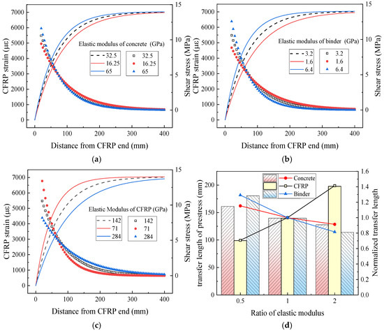 Influence of elastic modulus on prestress transfer behavior. (a) Elastic modulus of concrete; (b) elastic modulus of binder; (c) elastic modulus of CFRP; (d) transfer length of prestress.
