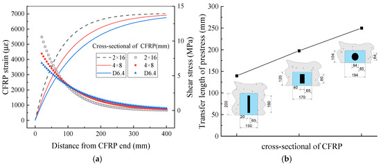 Effect of CFRP cross-section on prestress transfer behavior. (a) CFRP strain; (b) transfer length of prestress.