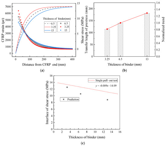 Effect of adhesive thickness on prestress transfer behavior. (a) CFRP strain; (b) transfer length of prestress; (c) comparison of shear stress.