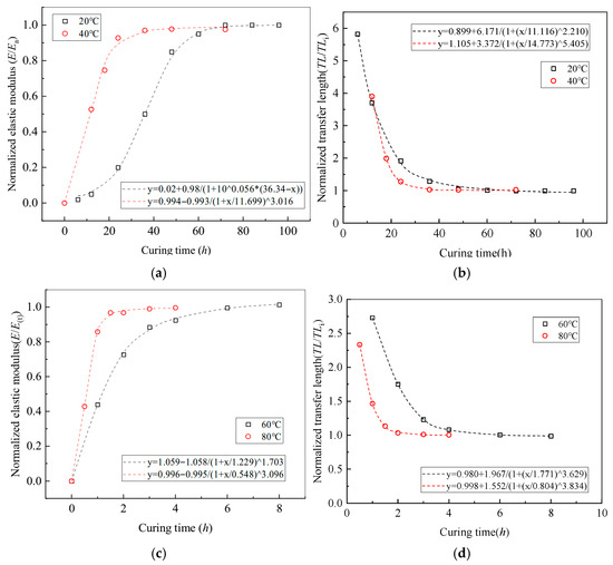 Figure 20 presents a normalized comparison of the elastic modulus of the epoxy resin and the prestress transfer length as functions of curing time at a constant temperature of 20 °C. As curing progresses, the degree of adhesive curing increases, resulting in a corresponding rise in effective bond stiffness and a gradual reduction in prestress transfer length. These trends are well characterized by exponential fitting models, as expressed in Equations (24) and (25):
