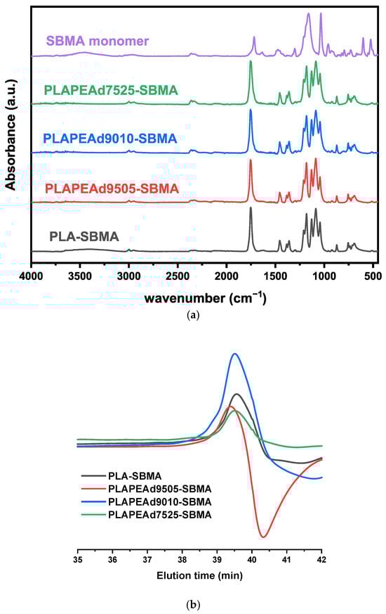 (a) FTIR spectra confirming SBMA grafting onto PLA and PLA/PEAd copolymers. (b) GPC chromatograms showing molecular weight distributions of synthesized zwitterionic copolymers.