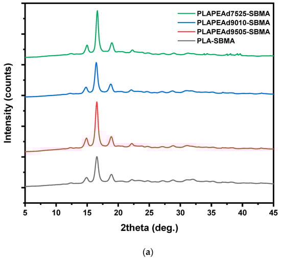 X-ray diffraction (XRD) analysis was employed to assess the crystalline structure of the zwitterionic copolymers and how it is influenced by PEAd content and SBMA grafting (Figure 2a). All SBMA-grafted samples displayed a semicrystalline character, evidenced by three distinct diffraction peaks located at 2θ ≈ 14.8°, 16.6°, and 18.8°, which are attributed to the (010), (110)/(200), and (203) lattice planes of the orthorhombic α-form crystalline phase of PLA, respectively []. Notably, the intensity and sharpness of these peaks decreased progressively with increasing PEAd content, reflecting a reduction in overall crystallinity. This trend was most pronounced in PLAPEAd7525-SBMA, where the broadening of all three peaks suggests significant disruption of PLA crystalline domains due to the flexible, amorphous nature of the PEAd segments. These results align with Klonos et al. [], who demonstrated that in PLA/PEAd blends, PEAd acts as a plasticizer that lowers PLA’s Tg, enhances segmental dynamics, and enables microphase-separated structures with tailored crystallization behavior.