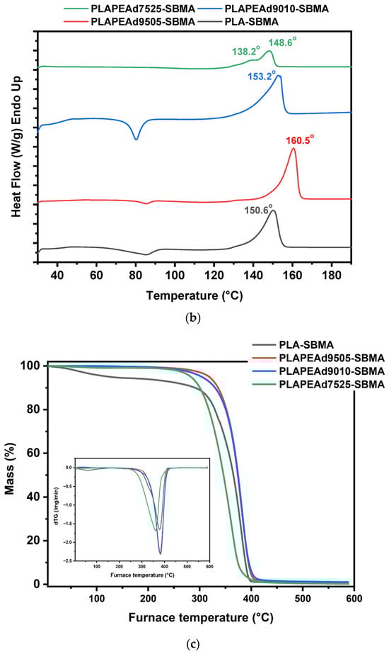 DSC analysis (Figure 2b) supported these structural observations. PLA-SBMA exhibited a melting temperature (Tm) of ~151 °C, consistent with semicrystalline PLA. Increasing the PEAd content led to a systematic decrease in melting enthalpy (ΔHm), indicative of reduced crystallinity. As expected, PLAPEAd7525-SBMA presented the lowest ΔHm, confirming the significant disruption of ordered domains. However, a notable exception was observed in PLAPEAd9505-SBMA, which exhibited a higher Tm (~160 °C) compared to the rest. This differentiation in thermal behavior likely stems from its higher molecular weight (Mn = 4900 g/mol) and broader molecular weight distribution (PDI = 1.38), as confirmed by GPC. Longer chain lengths may enhance segmental interactions and provide greater potential for chain folding, which facilitates lamellar thickening and the formation of more stable crystalline regions during thermal treatment. Furthermore, the broader dispersity could further contribute to this effect by allowing a subset of longer chains to act as nucleation centers, promoting heterogeneous crystallization. These two processes combined result in crystalline domains with higher thermal stability, thereby shifting the Tm upward despite the presence of flexible PEAd segments.