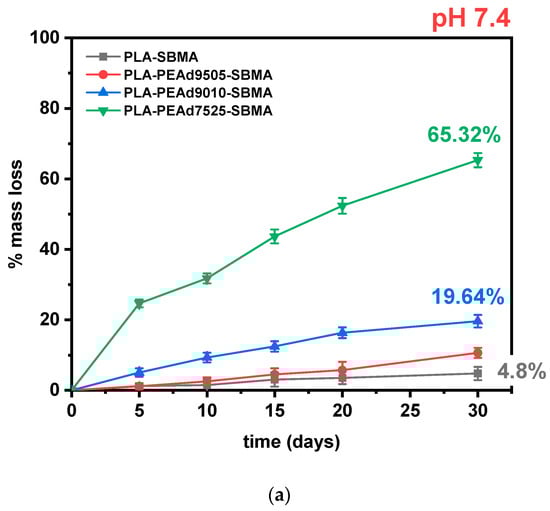As previously discussed, the matrix degradation was further accelerated and intensified under acidic conditions. Figure 4b visually confirms this extended loss of surface integrity and more pronounced porosity, in the case of PLA-SBMA and PLAPEAd7525-SBMA films, depicting the minimum and maximum effect, respectively. As can be seen, the microstructural deterioration correlates well with the quantitative mass loss data and underlines the crucial role of the PEAd segment in modulating degradation kinetics, further validating the potential of these materials for stimuli-responsive drug delivery applications. It is important to mention that in our study, we used copolymer films to provide controlled, reproducible conditions and to allow correlation with thermal, crystallinity, and morphology data. While degradation rates may differ in nanoparticles due to their substantially higher surface area-to-volume ratio, which enhances water uptake and accelerates hydrolytic scission, the composition-dependent trends (e.g., faster degradation of PEAd-rich formulations and enhanced sensitivity under acidic pH) are expected to remain consistent.