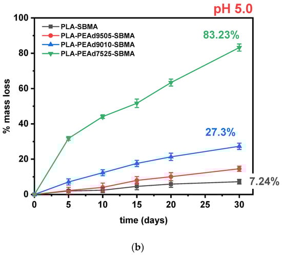 To assess the pH-responsive degradation behavior of the synthesized zwitterionic copolymers, hydrolytic degradation studies were conducted under simulated physiological (pH 7.4) and tumor-simulating acidic (pH 5.0) conditions over a 30-day period (Figure 3). The mass loss profiles demonstrated a clear dependence on both pH environment and copolymer composition. As expected, PLA-SBMA exhibited minimal degradation under neutral conditions, with less than 10% weight loss at pH 7.4, attributed to its semicrystalline structure and low water permeability. Its degradation rate remained low even under acidic conditions, confirming the inherent hydrolytic resistance and limited water penetration of the PLA matrix. In contrast, the incorporation of PEAd segments significantly increased degradation susceptibility, especially under acidic conditions. PLAPEAd7525-SBMA, which contains the highest PEAd content and lowest crystallinity (as evidenced by XRD and DSC), underwent rapid degradation, reaching 65% and 83% mass loss at pH 7.4 and 5.0, respectively. Similarly, PLAPEAd9010-SBMA and PLAPEAd9505-SBMA exhibited intermediate degradation rates, correlating with their moderate PEAd content and thermal/molecular properties. Mechanistically, under acidic conditions, ester hydrolysis proceeds via protonation of the carbonyl oxygen, increasing electrophilicity and accelerating chain scission; in aliphatic polyesters, this is further amplified by autocatalysis, as carboxylic acid end-groups formed during cleavage locally lower the microenvironmental pH and promote bulk erosion rather than purely surface-limited hydrolysis. This pathway is well documented for PLA-based materials and related polyesters [,].