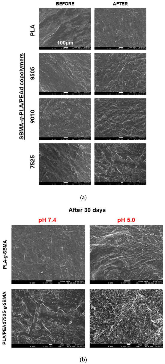 SEM analysis of the copolymer films (Figure 4a) revealed distinct surface morphological changes correlated with copolymer composition and environmental pH. Initially, all films exhibited smooth and continuous surfaces, indicative of homogenous copolymer structure. Upon 30 days of incubation in phosphate-buffered saline (PBS), significant differences emerged among the samples. PLA-SBMA films retained a relatively smooth surface with minor surface pitting, consistent with the slow and surface-limited hydrolysis typically observed in semicrystalline, hydrophobic polyesters. In contrast, the PLA/PEAd-SBMA copolymers, particularly PLAPEAd7525-SBMA, showed extensive surface erosion characterized by deep cracks, pores, and fragment detachment. These features suggest a shift toward bulk erosion, driven by increased water permeability and reduced crystallinity due to the higher PEAd content. The incorporation of flexible PEAd blocks lowers crystallinity, as confirmed by XRD and DSC data in our study, creating a larger amorphous fraction that is more easily penetrated by water molecules. This disrupted packing in PEAd-rich copolymers allows water to permeate more uniformly, promoting chain scission throughout the matrix, compared to semicrystalline PLA, where crystalline domains typically act as barriers to water uptake, confining hydrolysis to the surface.