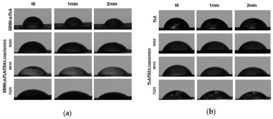 Static water contact angle images for (a) zwitterionic copolymer films and (b) neat copolymer films, demonstrating enhanced hydrophilicity with increased PEAd content and upon SBMA grafting. In both panels, images are shown from top to bottom for PLA, PLAPEAd9505, PLAPEAd9010, and PLAPEAd7525. For each sample, contact angles are displayed at three time points (0, 1, and 2 min).