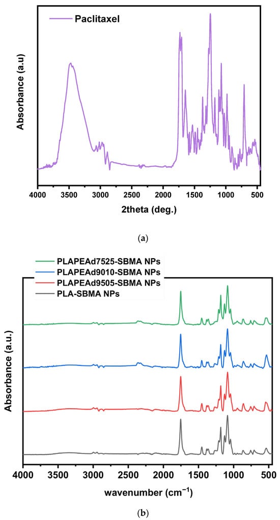 To confirm the presence of paclitaxel (PTX) within the zwitterionic nanoparticles and to assess potential drug–polymer interactions, FTIR analysis was employed. Figure 6a demonstrates the FTIR spectrum of pure PTX, exhibiting multiple characteristic bands attributed to its complex molecular structure, including a broad absorption band in the 3600–3400 cm−1 region corresponding to O–H and N–H stretching vibrations from hydroxyl and amide groups, several peaks in the 2950–2850 cm−1 region arising from aliphatic C–H stretching vibrations, the ester carbonyl (C=O) stretching vibration at 1731 cm−1, aromatic ring C=C stretches between 1600 and 1450 cm−1, amide-related vibrations near 1650–1630 cm−1, and absorption peaks in the 1240–1050 cm−1 range due to C–O–C ether stretches as well as secondary alcohols. Finally, the absorption band around 530 cm−1 corresponds to C–C skeletal bending vibrations or ring deformation modes, which are particularly typical to aromatic or fused ring systems, such as the taxane core present in PTX.
