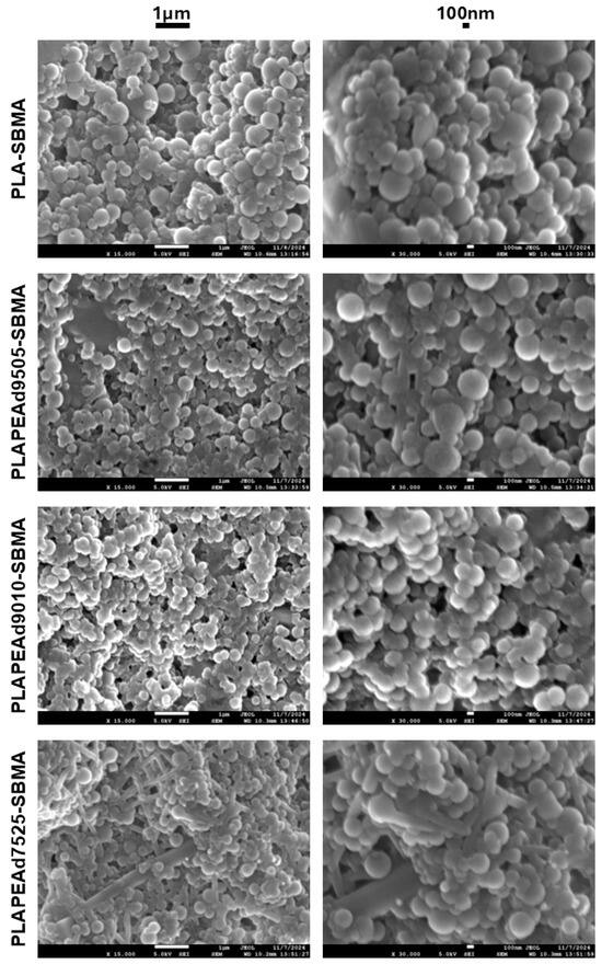 Among all formulations, the PLAPEAd7525-SBMA nanoparticles exhibited the most heterogeneous morphology, with the presence of not only spherical particles but also irregular rod-like or fibrillar structures visible on the surface, which however represented only a minor population. These rod-like features are likely a consequence of the high PEAd content (25 wt%), which introduces extensive chain flexibility and reduces crystallinity, leading to phase instability during emulsification and solidification. The increased segmental mobility, coupled with the broad polydispersity (PDI = 1.48), may result in partial phase separation or anisotropic chain packing, especially during solvent evaporation. Additionally, the reduced viscosity of the organic phase associated with the low molecular weight and soft-segment-rich composition may favor elongated micelle-like aggregation or chain coalescence into rod-like structures, rather than uniform spherical droplet formation.
