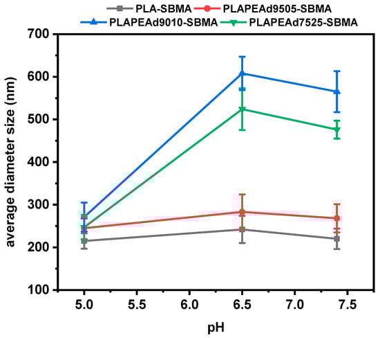 A key advantage of the zwitterionic nanoparticles was their pronounced pH-responsive size modulation. At acidic pH values (6.5 and especially 5.0), all nanoparticle formulations exhibited significant reductions in hydrodynamic diameter, a desirable trait for tumor-targeted delivery. This effect was particularly evident in PLAPEAd9010-SBMA, where particle size decreased from 565 nm to 271 nm, and in PLAPEAd7525-SBMA, from 476 nm to 247 nm. Such shrinkage is likely driven by acid-catalyzed hydrolysis of ester bonds, enhanced polymer degradation, and subsequent collapse or compaction of the polymer network. The effect was less pronounced in PLA-SBMA, whose semicrystalline, hydrolytically resistant structure limited pH responsiveness. This pH-dependent size shrinkage supports the copolymers’ degradation data (Figure 3) and confirms the dual contribution of PEAd content and zwitterionic character to the environmental responsiveness of the system. Moreover, the presence of zwitterionic SBMA side chains contributes not only to the observed pH-responsive size modulation, but also to improved colloidal stability through enhanced hydration and charge shielding. This dual function, recently reviewed in detail [], is also consistent with our findings, where all formulations maintained stable colloidal dispersions across physiological and acidic pH conditions. In overall, the reversible size changes could facilitate enhanced tumor penetration, cellular uptake, and controlled drug release specifically in acidic microenvironments.