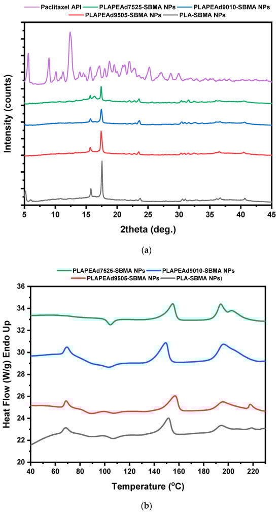 Upon closer analysis of the comparative DSC thermograms (Figure 9b), a weak endothermic peak near 200–205 °C was observed in select formulations (PLA-SBMA and PLAPEAd9505-SBMA), suggesting the presence of a small fraction of crystalline paclitaxel. However, the peak was significantly attenuated compared to that of pure PTX, which typically displays a sharp melting endotherm around 217 °C, confirming that the largest amount of the drug is encapsulated in the amorphous state. In addition, a broad endothermic event around ~70 °C was visible in all thermograms except PLAPEAd7525-SBMA. This signal likely corresponds to a glass transition or cooperative relaxation event within the polymer–drug matrix. Its absence in the high-PEAd sample may be due to increased chain flexibility and phase disorder, which obscure this thermal feature.