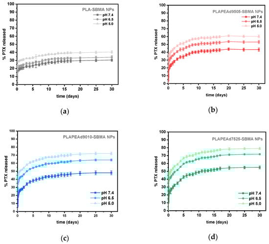 In general, all formulations displayed strong pH-dependent release behavior, with accelerated PTX diffusion under acidic conditions, validating the stimuli-responsive design of the system. At pH 7.4, cumulative release values ranged from ~30% for PLA-SBMA to ~55% for PLAPEAd7525-SBMA, indicating moderate but formulation-dependent matrix permeability. PLA-SBMA nanoparticles released the lowest amount of drug across all conditions, reflecting their semicrystalline structure, hydrophobic surface, and high hydrolytic stability discussed earlier. In contrast, PLAPEAd7525-SBMA released ~54% of its PTX payload at pH 7.4 and up to ~79% at pH 5.0, demonstrating a more porous, rapidly degrading matrix (65–83% mass loss at pH 7.4 and 5.0, respectively) consistent with its high PEAd content (25%) and low crystallinity. PLAPEAd9010-SBMA followed a similar trend, with ~48% release at pH 7.4 and ~72% at pH 5.0. Its large size and relatively low molecular weight facilitated matrix destabilization and drug release under acidic conditions, whilst PLAPEAd9505-SBMA exhibited intermediate behavior, releasing ~43% of PTX at pH 7.4 and ~52% at pH 5.0. Its higher molecular weight and lower degradation rate (mass loss ~34% at pH 5.0) slowed drug release, offering a more controlled profile.