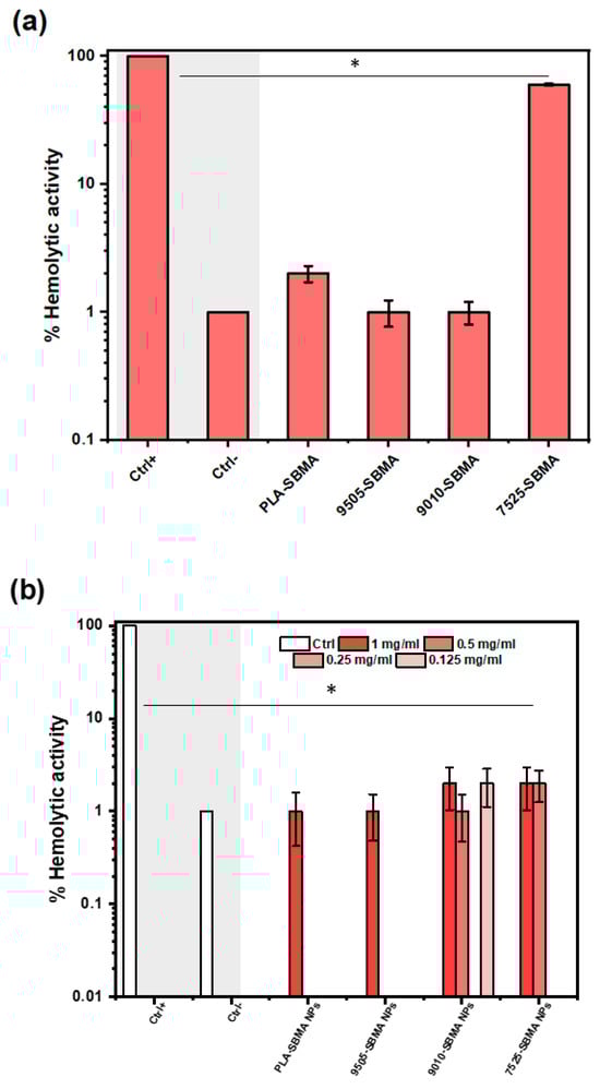 Hemolysis percentages for (a) the four neat zwitterionic copolymers, and (b) different nanoparticle concentrations (0.125, 0.25, 0.5 and 1 mg/mL) of each formulation at body temperature (37 °C), after 24 h incubation with RBCs. The symbol * represents the statistically significant differences between each compound and the positive control group (Ctrl+).