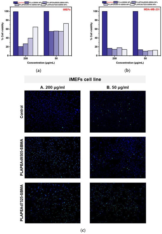 % Cell viability assay of (a) iMEF and (b) MDA-MB-231 cells treated with nanoparticle extracts, and (c) Fluorescent microscopy images upon iMEF cell line treatment with PLAPEAd9505-SBMA and PLAPEAd7525-SBMA zwitterionic nanoparticles at two different concentrations (A: 200 µg/mL, B: 50 µg/mL), indicating nuclear staining with Hoechst and CellTox™ Green fluorescence.