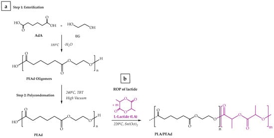 Schematic illustration of (a) the two-step poly(ethylene adipate) synthesis, and (b) the PLA/PEAd copolymers synthesis via ROP.