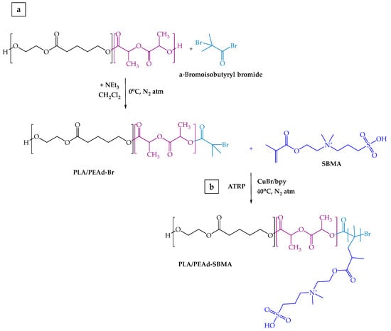 Drawing from previous literature reports [], the grafting of the zwitterionic monomer [2-(Methacryloyloxy)ethyl]dimethyl-(3-sulfopropyl)ammonium hydroxide (SBMA) onto the PLA/PEAd copolymers was achieved via a two-step ATRP synthetic process using α-bromoisobutyryl bromide (BIBB) as the initiator (Scheme 2). First, an appropriate amount of PLA/PEAd copolymer was dissolved in anhydrous dichloromethane (DCM) and reacted with BIBB, in the presence of triethylamine (TEA) under nitrogen at RT for 18 h, to introduce bromide functional groups. The modified copolymer was then purified by precipitation in cold methanol and dried under vacuum. The ATRP reaction was carried out by dissolving the brominated PLA/PEAd in a mixture of SBMA monomer, CuBr catalyst, and 2,2′-bipyridine (bpy) ligand in a degassed methanol/water (1:1) solvent system. The reaction proceeded under nitrogen and continuous stirring at 40 °C for 24 h. Upon reaction completion, the zwitterionic copolymers were precipitated in an excess amount of acetone, filtered, dialyzed in a membrane tubing against deionized water for two days, and finally dried under vacuum. The SBMA-grafted copolymers were thoroughly characterized with a combination of supplementary techniques and then stored in a desiccator at room temperature until further use.
