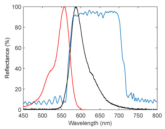 Measured reflectance of the DFB film (blue curve) used for Cavity B. For comparison, the normalized measured absorption (red) and emission spectrum (black) of the Rhodamine B dye solution in water are also shown.
