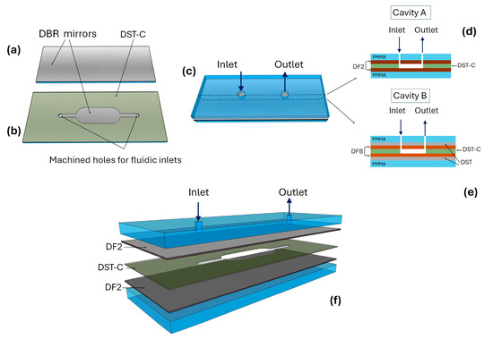 (a) PMMA substrate with laminated DBR mirror and (b) PMMA substrate with laminated DBR mirror, DST-C layer and fabricated fluidic holes. (c) Schematic of the assembled device with transverse section of (d) Cavity A and (e) Cavity B. (f) Exploded view drawing of Cavity A.