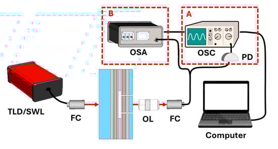 The optical properties of Cavity A were characterized using a tunable laser diode (TLD) with an emission wavelength range of 765–781 nm (TLB 6700, New Focus), Irvine, CA, USA. The laser output was coupled into a single-mode (SM), polarization-maintaining GRIN fiber collimator (FC). The transmitted signal was collected through a 5× objective lens (OL) and sent to a photodiode (PD) connected to an oscilloscope (OSC) for spectral measurements (Figure 3, configuration A). The OSC records the optical signal received from the PD as a function of time. Since this time is related to the scan wavelength of the tunable source, the optical spectrum can be reconstructed from the OSC signal. To achieve precise optical alignment, we used micrometer-resolution kinematic mirror mounts and translation stages.