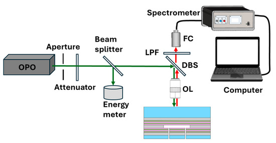 The experimental set-up for lasing characterization is depicted in Figure 4. Measurements were performed in reflection mode. A laser beam, with a wavelength of 557 nm, pulse duration of 8 ns and a repetition rate of 10 Hz, emitted by a pulsed optical parametric oscillator (OPO) (GWU OPO primoScan, Erftstadt, Germany) pumped by a Nd:YAG lasers (Quantel Q-smart, Les Ulis Cedex, France), is normally incident onto the FP microcavity through the front planar mirror with a focal spot size of about 160 μm. The pump energy can be varied using a polarization-based laser attenuator. The lasing generated by the excitation of the gain medium is filtered out by dichroic beam splitter and a long-pass filter (LPF) and finally collected by an optical fiber and delivered to a spectrometer (resolution 0.6 nm).