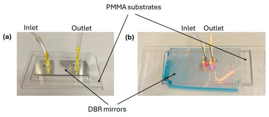 Fabrication steps of the cavities are schematized in Figure 2. The cavities consist of two halves of PMMA substrates. The first step involves laminating the top and bottom DBR mirrors onto both PMMA substrates (Figure 2a,b). After that, a double-sided tape (DST-C) is laminated onto one of the PMMA substrates (Figure 2b). Each layer is carefully applied using a laminating roller, ensuring a bubble-free bond at every stage.