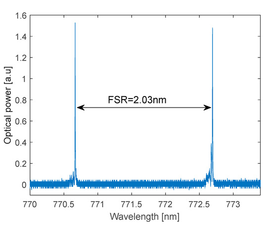 Figure 6 shows the measured transmission spectrum of Cavity A. During the measurement, the cavity was filled with water through the integrated microfluidic channels. Distinct optical resonance peaks arise from constructive interference due to multiple reflections between the cavity mirrors (Figure 6). A detailed view of one optical resonance is shown in Figure 7, where the resonance has been fitted with a Lorentzian curve. The full width at half maximum (FWHM) of the resonances is approximately Δλ ≈ 3.6 pm, corresponding to a Q-factor of 2.15 × 105. The measured free spectral range (FSR) is 2.03 nm. We measured a cavity finesse F = FSR/Δλ = 554.