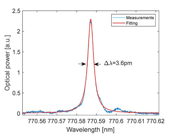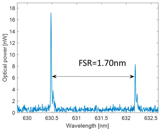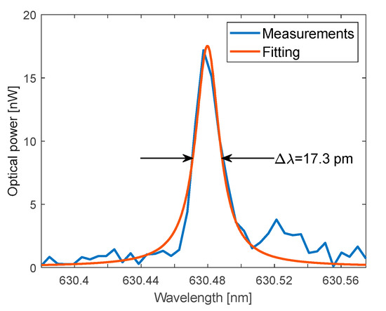 The measured FSR is 1.70 nm. Figure 10 shows a close-up view of the resonance peak at λ0~630.48 nm of Figure 9 for which a Lorentzian fit yields a resonance linewidth with a FWHM of Δλ = 17.3 pm, and the resulting quality factor is Q = λ0/Δλ = 3.64 × 104. The cavity finesse is F = 98.