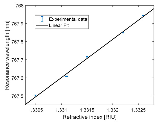 Each data point in Figure 8 corresponds to the mean resonant wavelength derived from fifteen measurements, with error bars indicating the standard deviation. The bulk refractive index sensitivity was determined from the slope of the linear regression fit to the resonant wavelength versus refractive index data, yielding a sensitivity of 212 ± 7 nm/RIU (R2 = 0.9969). The observed uncertainty arises primarily from (i) environment temperature fluctuation and (ii) the measurement accuracy of the Abbe refractometer available in our laboratory (±2.5 × 10−4 RIU resolution). The refractive index limit of detection (LOD), defined as the smallest detectable refractive index variation, depends on both the sensitivity (S) and the spectral resolution (δλmin) following the relation LOD = δλmin/S. Typically, δλmin ranges between Δλ/50 and Δλ/100 and is influenced by noise sources [23]. Under the assumption of δλmin = Δλ/50 (representing the worst-case scenario), the bulk sensitivity measurement suggests a theoretical refractive index LOD of 3.4 × 10−7 RIU. By considering that the mean standard deviation of the peak wavelengths reported in Figure 7 is equal to 2.2 pm, the LOD with this experimental set-up is limited to 1.04 × 10−5 RIU, mainly due to the absence of thermal stabilization of the system.