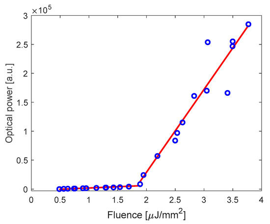 Figure 11 presents the spectrally integrated emission power across the 620–680 nm band as a function of incident pump fluence, showing characteristic nonlinear behavior that transitions from spontaneous to stimulated emission. Linear regression analysis of the sub-threshold and above-threshold regions reveals a distinct lasing threshold at 1.83 μJ/mm2. The threshold value is determined by the intersection point of linear fits to the spontaneous and amplified emission regimes, which defines the threshold condition.