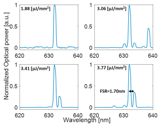 Figure 12 shows the laser emission spectra of the FP cavity above threshold at four different pump fluences with resonance peaks centered at λ0 = 632 nm. The FSR of the cavity is 1.7 nm, in good agreement with transmission characterization.