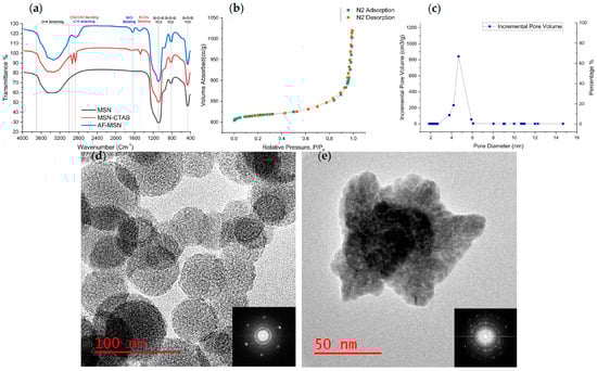 AF-MSNs display a type-IV isotherm with H1 hysteresis (Figure 1b), typical of uniform mesoporous silica []. The BET surface area is 861 m2 g−1 (single-point ≈ 858 m2 g−1; t-plot external ≈ 867 m2 g−1), within the 600–1000 m2 g−1 range reported for aminated MSNs [,,]. BJH pore-size distribution (Figure 1c) is narrowly centered at 4.8 nm, and the cumulative pore volume reaches 0.69 cm3 g−1, confirming a well-developed, uniform mesopore network. A minor microporous contribution (≈55 m2 g−1, Dubinin–Astakhov) is consistent with previous reports for post-grafted MSNs [,].
