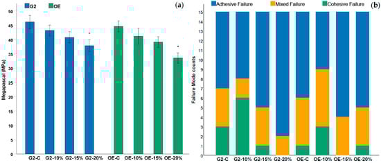 A failure mode analysis (Table 1; Figure 2b) (adhesive/mixed/cohesive) revealed a shift toward adhesive failures at the 20 vol% level for both systems (G2-20%: 13/2/0; OE-20%: 10/4/1), consistent with the lower μTBS values. In contrast, the control and ≤15 vol% groups showed a more balanced distribution, with a higher proportion of mixed failures.