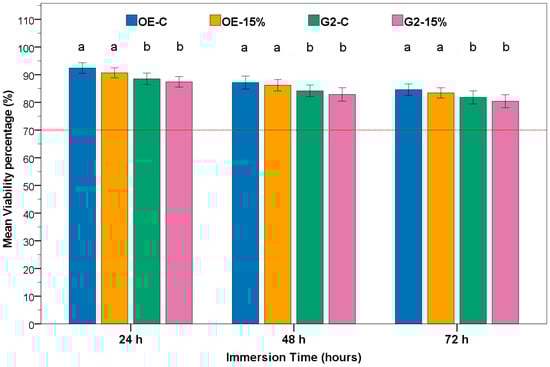 Viability of human periodontal ligament fibroblasts exposed to adhesive extracts (mean ± SD, n = 6 discs → 1 extract, assayed in triplicate wells). Bars show mean cell viability (%) after 24 h, 48 h, and 72 h for adhesive type (G2 and OE) and nanofiller loading (C, 15%). The red dotted line marks the ISO 10993–5:2009 noncytotoxic threshold (70%). Within each time point, bars that do not share the same lowercase letter differ significantly (p < 0.05; two-way ANOVA, factors = adhesive type× nanofiller loading, Bonferroni post hoc on estimated marginal means).