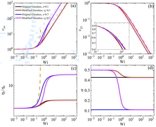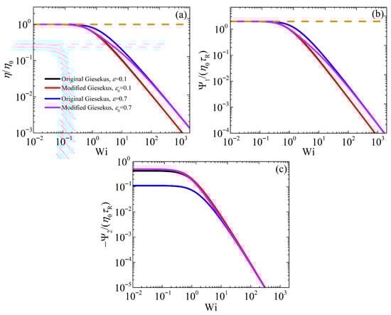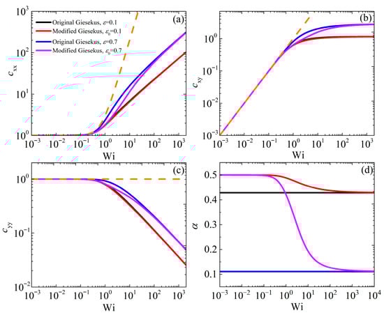 Figure 3 shows the conformation tensor elements , , the dimensionless elongational viscosity (), and α versus Wi. In Figure 3a, starts from its equilibrium value of unity at low Wi for both models, in agreement with the UCM model predictions (with α = 0), and then increases with Wi, with higher values as or increases to 0.7. Similarly, in Figure 3b, also starts from its equilibrium value of unity at low Wi for both models, but then decreases as the shear rate increases, exhibiting higher values as or increases. The elongational viscosity starts from the value of 3, as per Trouton’s law, which is in line with experimental data [,], and increases as the elongation rate increases, exhibiting smaller values as or increases [Figure 3c]. When = 0.1, both models provide similar predictions for both and , whereas the prediction of the modified model is below the prediction of the original model for , since α is larger in this Wi range [Figure 1d]; on the contrary, it seems that the prediction for is the same for both models, even with a larger value of or . The predictions for are noted to be the same for both models at large values of or , whereas at smaller values, the modified version is below the original Giesekus model’s prediction in the intermediate range of elongation rates. The scaling at large shear rates is the same for both models, namely, and , whereas, as mentioned above, the elongational viscosity always reaches the asymptote . This is in contrast to experimental evidence that suggests that the elongational viscosity reaches a maximum value and then decreases at higher elongation rates [].