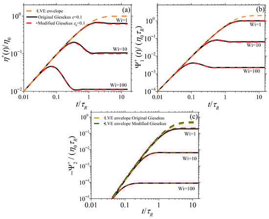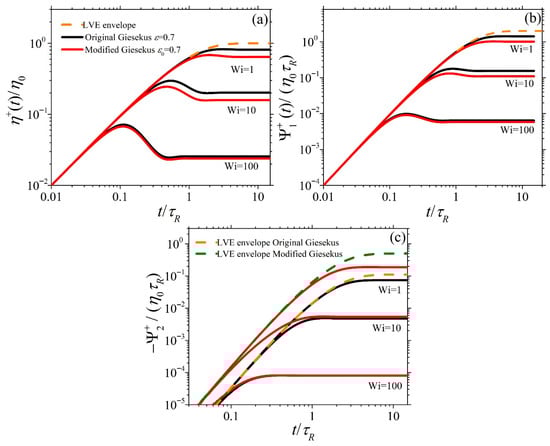 Figure 4 and Figure 5 show the dimensionless material functions , , and for start-up SSF as a function of dimensionless time for = 0.1 and = 0.7, respectively, at Wi = 1, 10, and 100. In Figure 4a,b, the predictions of and for both models exhibit similar overall trends for all Wi: They increase at early times following the LVE envelope (Equation (6)), reach an overshoot, and then decrease before reaching their steady state value; this is in line with experimental evidence [,]. Also, both models’ shear viscosity predictions present an undershoot after the overshoot, which is more easily noticeable at Wi = 100. This oscillatory behavior for the original Giesekus model was first noted by Giesekus []. Such undershoots, first provided by the experimental work of Costanzo et al. [], have been associated with the tumbling of polymer chains in simple shear [,]. When or is small (=0.1), the predictions of the original and modified Giesekus models are identical, as seen in Figure 4, whereas at a larger value (=0.7), there are clear differences between the original and modified models (Figure 5). In particular, the predictions of the modified Giesekus model for and are noted to be below the original Giesekus model predictions at large times for intermediate shear rates (Wi = 1 and 10), whereas the predictions are similar at larger shear rates irrespective of time. On the other hand, the predictions of the two models for are noted to be completely different even in the LVE regime, as indicated by the different expressions for the LVE envelope [see Equation (6)]. The modified model is seen to shift upwards following Equation (6b) and is noted to predict a larger value than the original model at small shear rates (Wi = 1). However, at larger shear rates (Wi = 10 and 100), both models exhibit the same steady-state value. This behavior is more in line with experimental data []; as seen in Figure 8b of Stephanou et al. [], the LVE envelope predicted by the original Giesekus model (note that the LVE envelope provided there is not the same as the original Giesekus model provided here; however, due to the small value of the slip parameter considered in their work, ξ = 0.03, their LVE envelope should not differ substantially from the original Giesekus model one) is below the LVE envelope suggested by the experimental data. Thus, the use of a variable Giesekus parameter, as done in the modified model, would certainly improve the comparison against said experimental data.