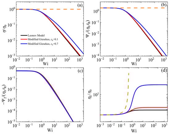 In Figure 6a,c, we illustrate the variations in the viscometric functions, as functions of the dimensionless shear rate (Wi), in the case of steady-state SSF when the Leonov model is compared with the modified Giesekus model at two different values of (0.1 and 0.7). Similarly, Figure 6d illustrates the scaled elongational viscosity, , in steady-state UEF, in which case the Leonov model is analytically solvable; the solution is the same as Equation (7) with α = 0.5. (The corresponding variations in the conformation tensor components are provided in Figure S1 for SSF and Figure S2 for UEF, respectively.) We note that when = 0.1, the modified Giesekus model predictions are almost the same as the Leonov model’s ones, which is expected since the Giesekus parameter in the modified model changes only slightly (from 0.5 at equilibrium to = 3/7 ≈ 0.43 at Wi >> 1). However, when = 0.7, the predictions of the modified Giesekus model are above Leonov’s in the non-linear regime as expected, since the Giesekus parameter in the modified model changes considerably (from 0.5 at equilibrium to 1/9 ≈ 0.11 at Wi >> 1). The only exception is the second normal stress coefficient [Figure 6c], which is seen to be almost the same as in the Leonov model. The corresponding comparison in start-up shear flow is provided in Figures S3 and S4.