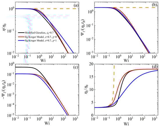 The IK model, as presented here, includes two parameters: α and χ. When χ = 0, it coincides with the original Giesekus model. The variations in the viscometric functions, as functions of the dimensionless shear rate (Wi) in the case of steady-state SSF, when the IK model is compared with the modified model with = 0.7, meaning = 1/9 ≈ 0.11 at Wi >> 1, which is the value selected in the IK model, are presented in Figure 7a–c, whereas Figure 7d illustrates in steady-state UEF. Note that since the structural variable is not the same in the two models (conformation tensor based on the chain end-to-end vector in our case, and gyration tensor in the IK model), it is not possible to compare the predictions between the two structural variables. Also, since α is a common parameter in both models (as we chose to present the IK model here), we only need to describe the influence of χ on the various material functions. The modified Giesekus model is noted to decrease faster at intermediate Wi values (approx. 0.5 < Wi < 10), but as the χ value in the IK model increases, the difference between the two models becomes smaller. Furthermore, at large shear rates, by increasing χ, the IK model exhibits a smaller power-law behavior, approx. −0.77, which is noted to be more in accord with experimental data. On the other hand, predictions are noted not to differ significantly (both models exhibit a power-law behavior at large shear rates close to −3/2), whereas the prediction of the IK model for , by increasing χ shifts to smaller Wi values, provides smaller values relative to the modified Giesekus model prediction, whereas the power-law behavior at large shear rates is the same. Clearly, as expected, the zero-rate prediction differs. Lastly, we note that increasing χ in UEF results in a slower approach to the asymptotic limit at large elongation rates, but this limit is the same for two models. Note that for a smaller value, the differences between the two models are smaller (cf. Figure S5). The corresponding comparison in start-up shear flow is provided in Figures S6 and S7.