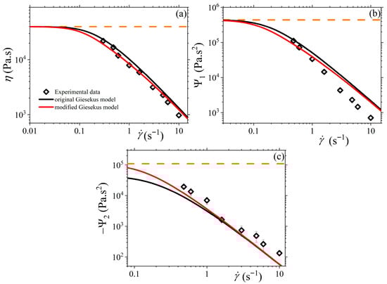 Comparison of the predictions of both the original and modified Giesekus models with the experimental data presented in Ref. [] for (a) the shear viscosity, (b) the first normal stress coefficient, and (c) the second normal stress coefficient, at steady state. Parameter values: , and , or α = 0.2 for the original Giesekus model. The orange dotted lines depict the predictions of the UCM model (with α = 0).