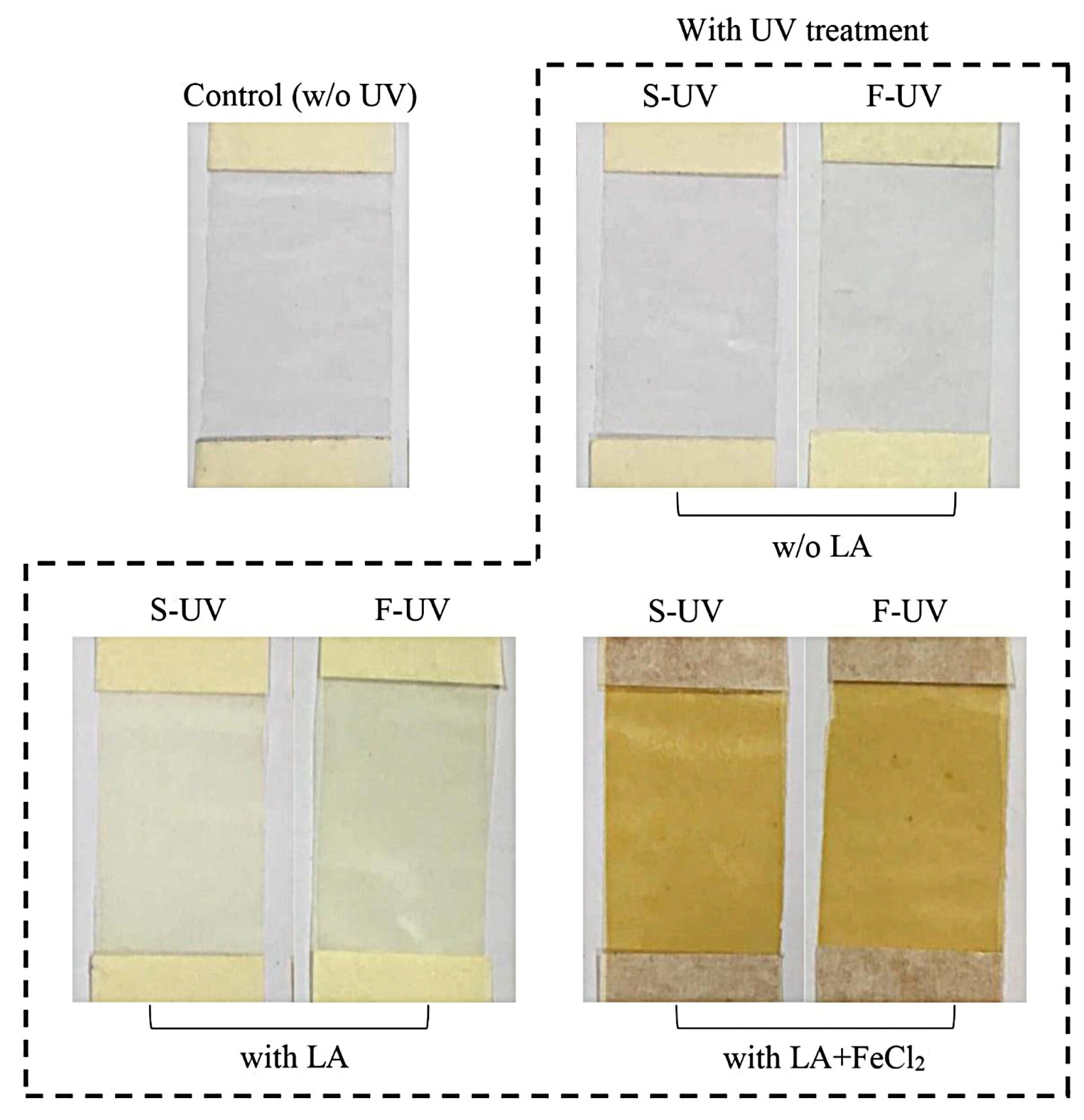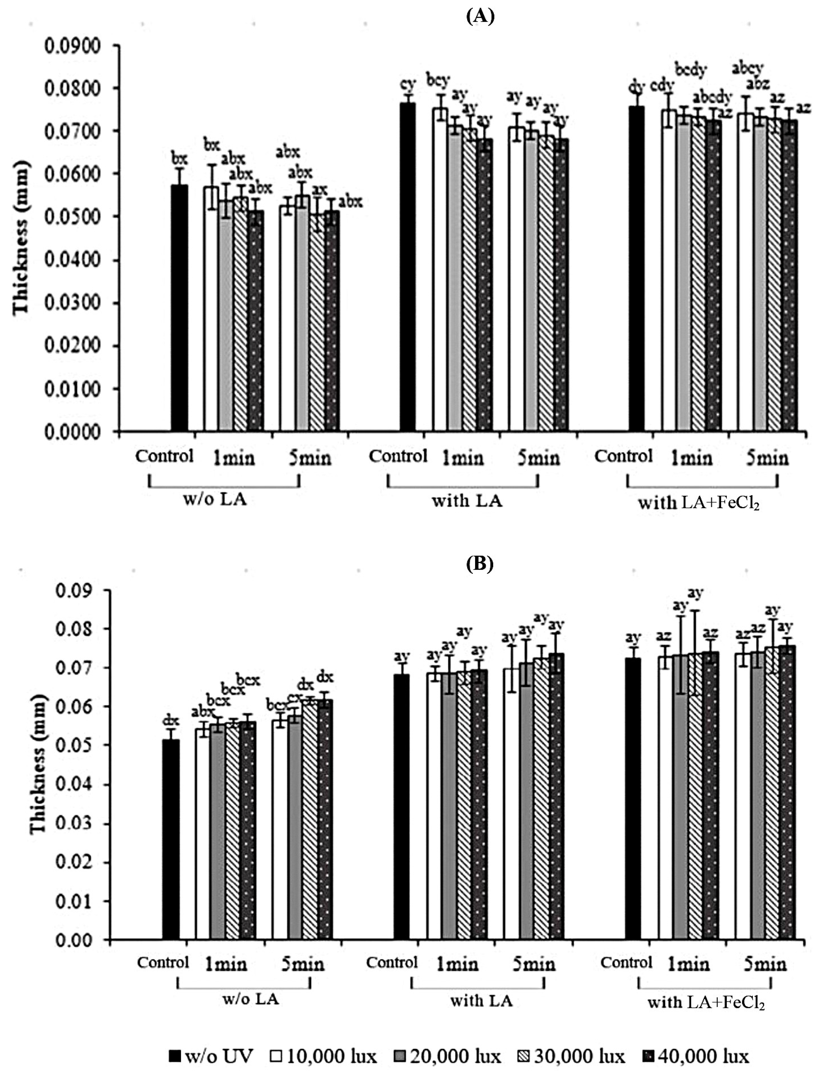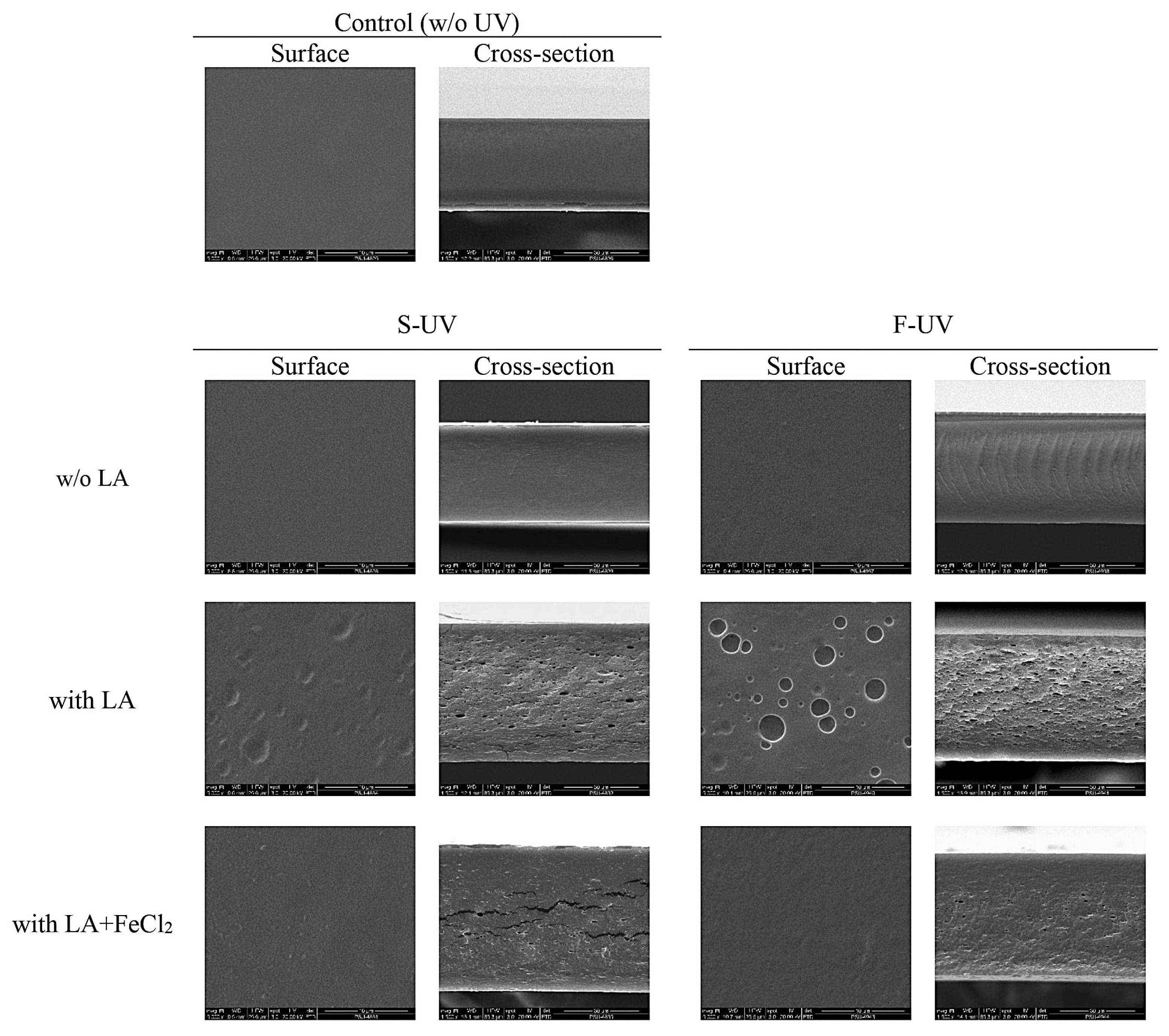 3.1. Properties of Fish Skin Gelatin Films with Incorporation of Linoleic Acid (LA) and Ferrous Chloride (FeCl2) as Affected by UV Irradiation