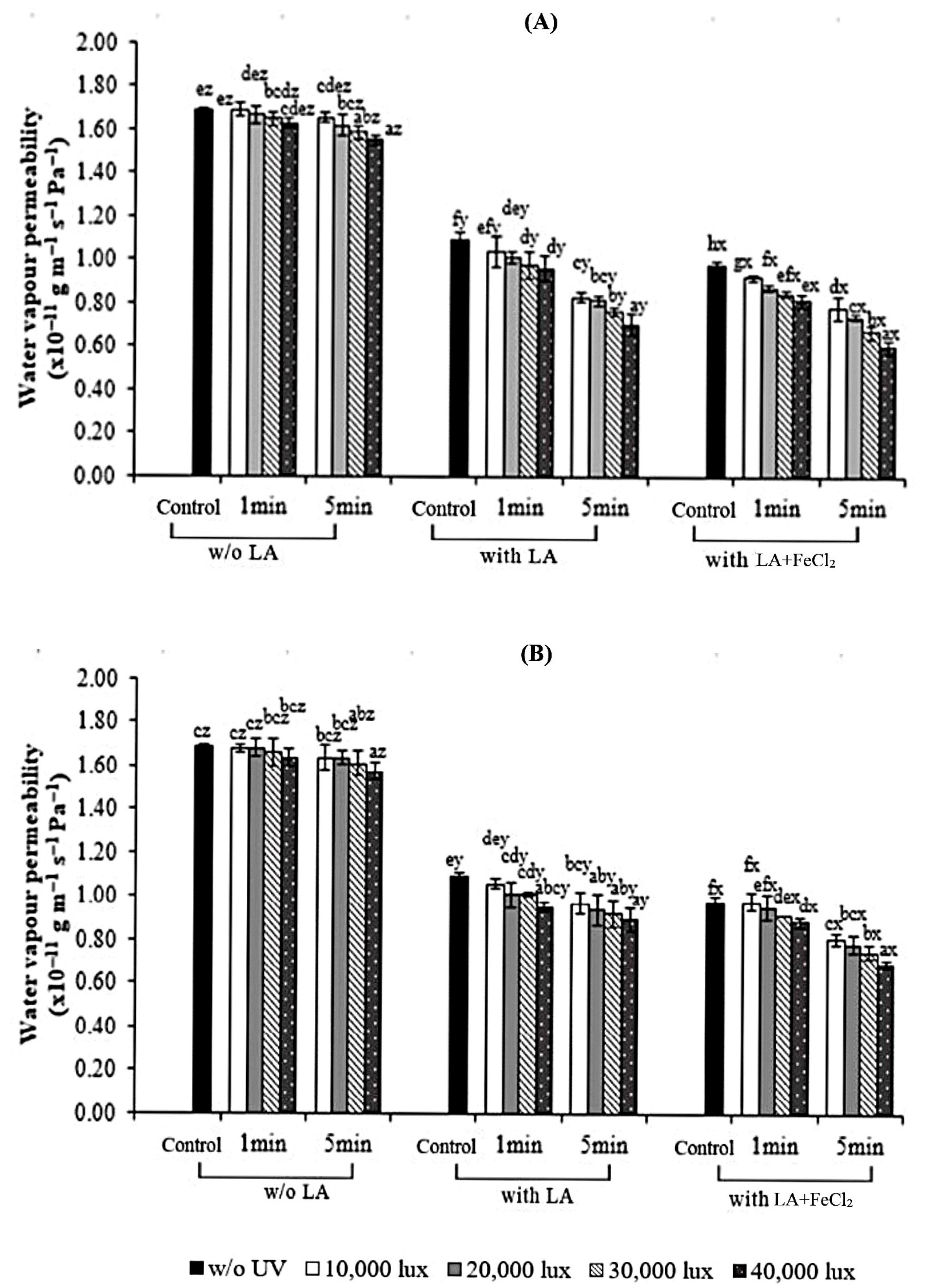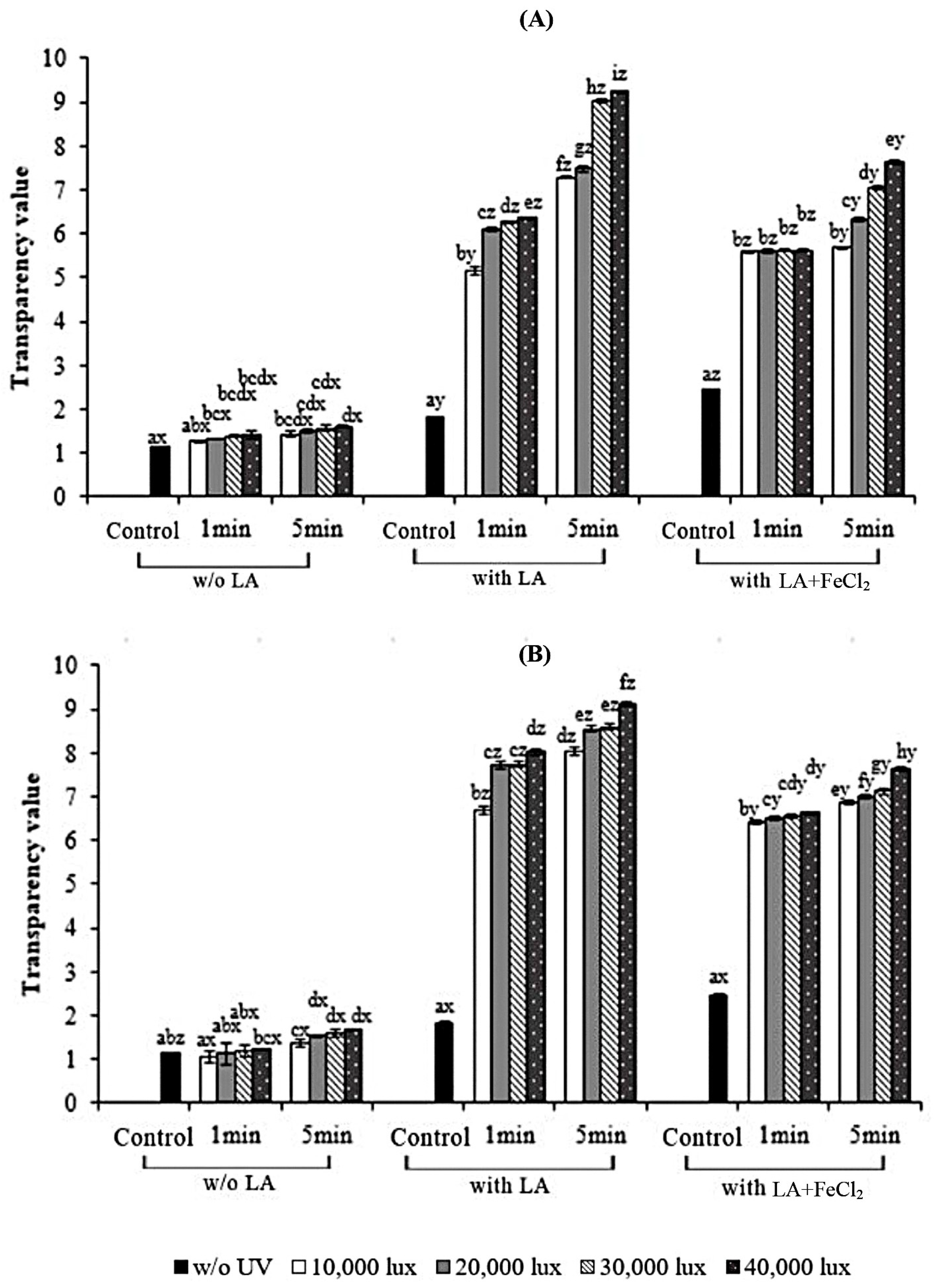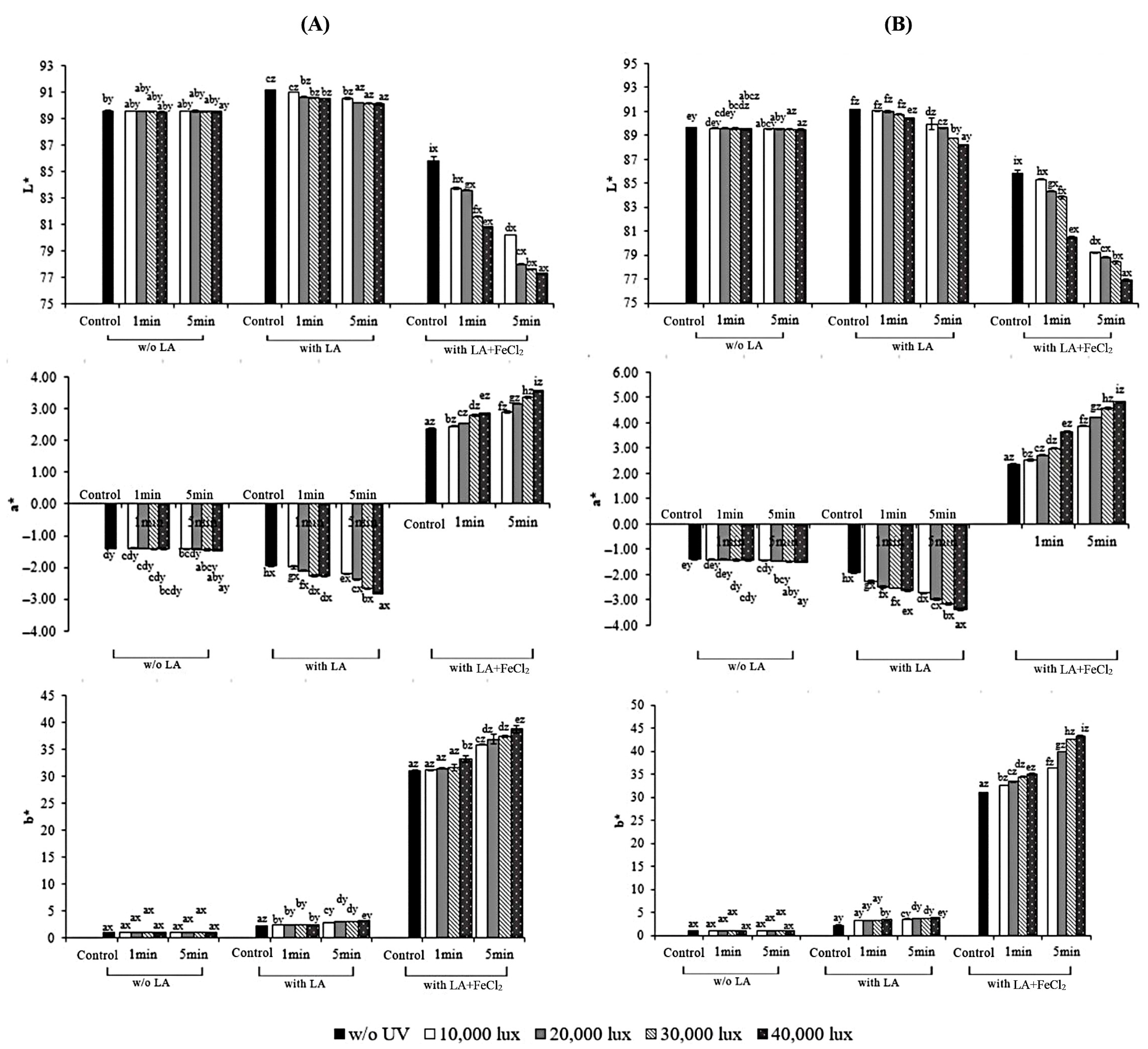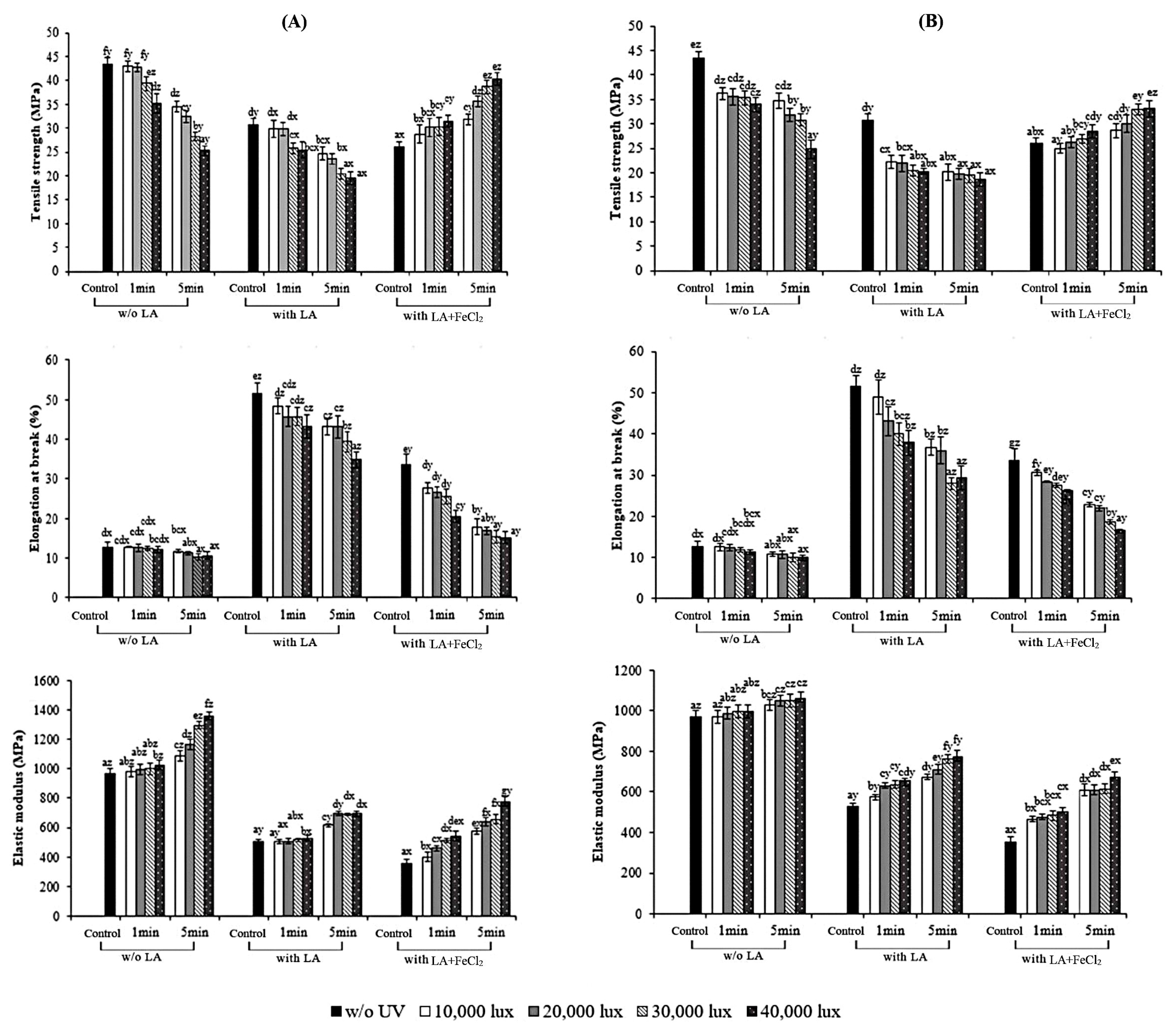3.1. Properties of Fish Skin Gelatin Films with Incorporation of Linoleic Acid (LA) and Ferrous Chloride (FeCl2) as Affected by UV Irradiation