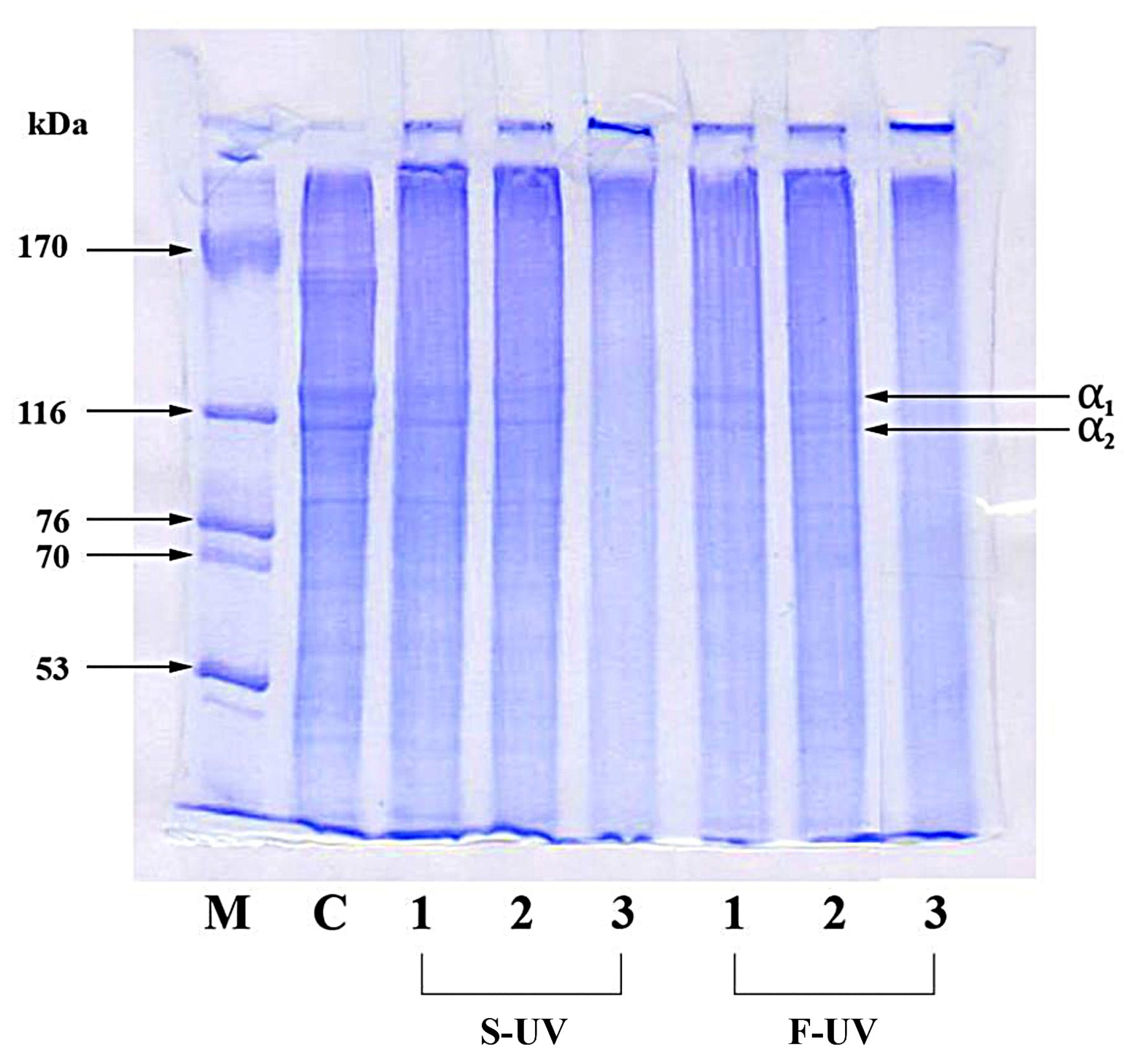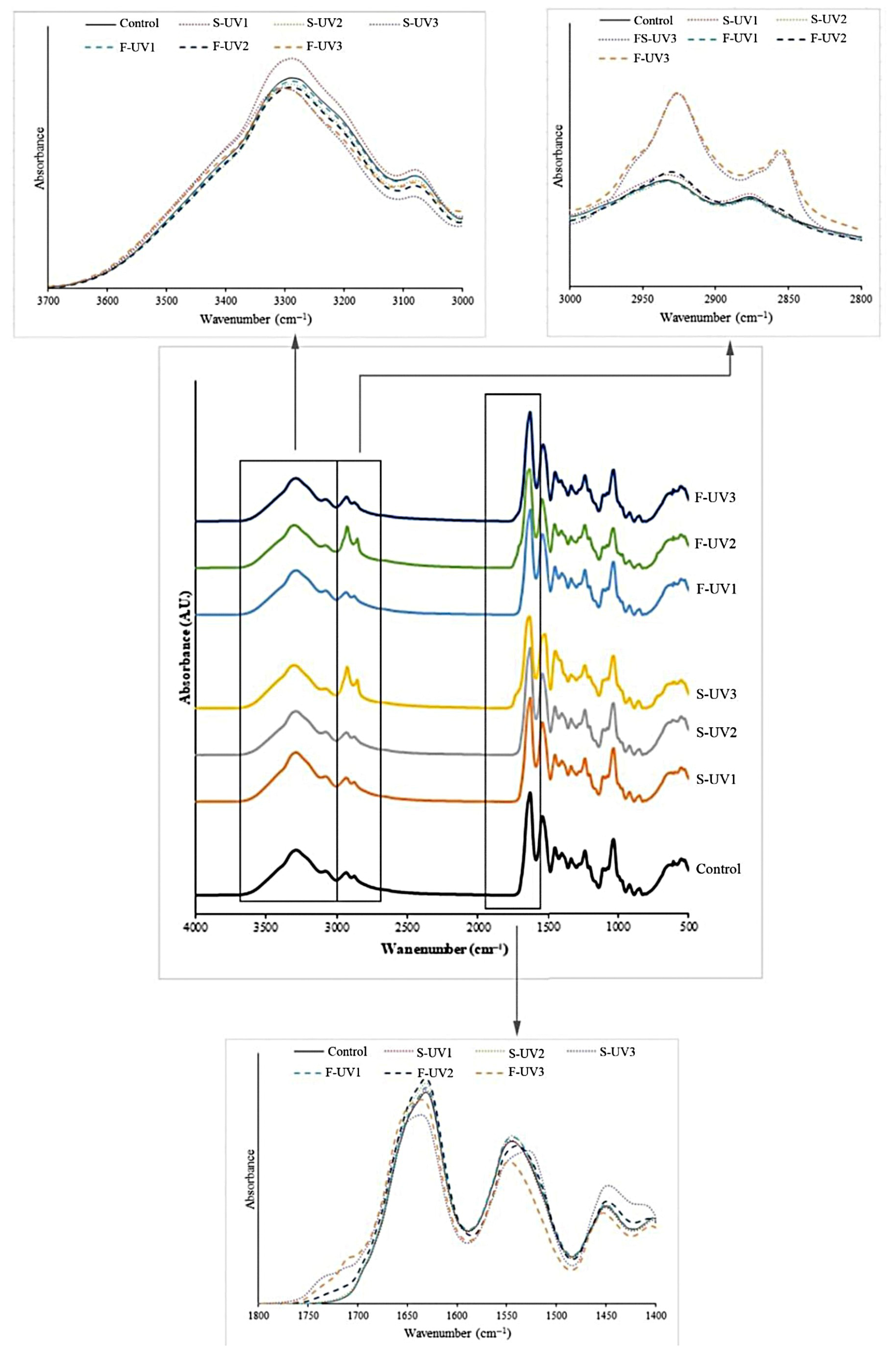 - Metreveli, N.; Namicheishvili, L.; Jariashvili, K.; Mrevlishvili, G.; Sionkowska, A. Mechanisms of the influence of UV irradiation on collagen and collagen-ascorbic acid solutions. Int. J. Photoenergy 2006, 2006, 76830. [Google Scholar] [CrossRef]