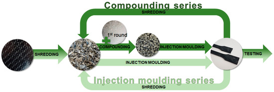 PP–glass-fibre organosheets were shredded and processed in two ways to represent multiple recycling sequences applied to short-fibre-reinforced composites. One series was done, representing a whole processing chain, by extruding the organosheet pieces in a twin-screw compounder, both as pure pieces and with additional PP, to obtain different fibre contents. The granules produced in this way were injection moulded into test specimens, shredded, and reprocessed twice. The second series was done to compare the process to a reduced processing chain, without the compounding step. The chopped organosheet was injection moulded into test specimens, shredded, and reprocessed two times.