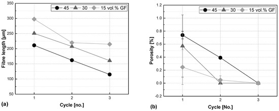 Fibre length (a) and porosity (b) vs. processing cycle number of glass-fibre-reinforced composites made from organosheets with a fibre share of 45, 30, and 15 vol.% (Remark: Some error bars given in the figure are smaller than the symbol size).